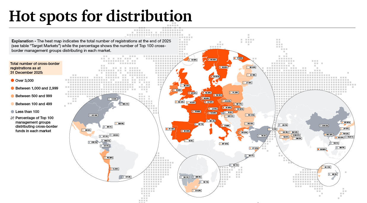 This year's edition provides the Top Cross-Border management groups, including the different domicile platforms they use for international sales. It highlights the evolution of cross-border distribution, the hotspot targets, as well as the key target markets of leading fund domiciles.